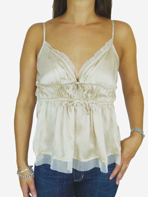 Light pink silk camisole top with netted cotton trim. Drawstring ties under bust line. Adjustable shoulder straps.