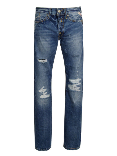Description Regular classic five pocket style jeans. Slim hips with regular leg. Slightly faded and worn with distressed effect. Button fly. Colour: Medium blue denim.